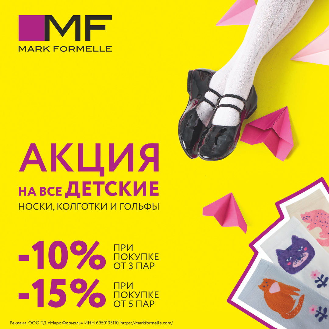 С 19 августа по 7 сентября в Mark Formelle специальное предложение на все детские чулочно-носочные изделия: при покупке трех или четырех товаров - скидка 10%, а при покупке от пяти товаров – скидку 15%!